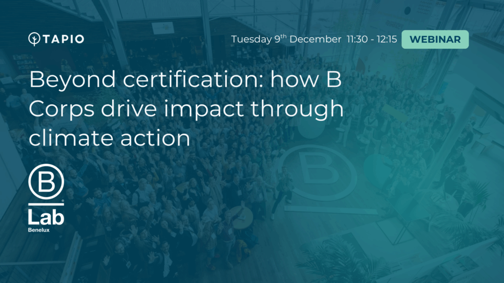 Rejoignez Tapio et B Lab pour une session inspirante de 45 minutes afin de découvrir comment les entreprises peuvent transformer leurs ambitions climatiques en actions concrètes dans le cadre du programme B Corp.